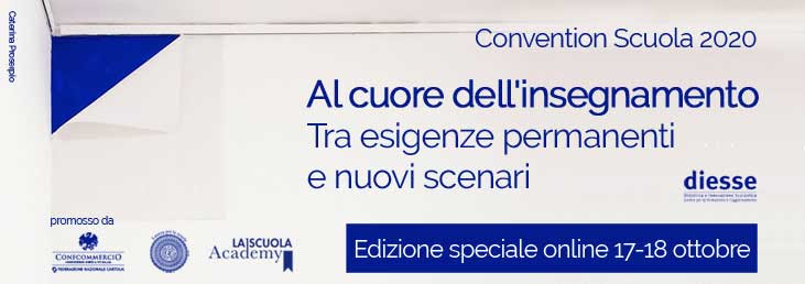 Segnaliamo che sono aperte le iscrizioni alla Convention Scuola 2020 di Diesse dal titolo "Al cuore dell’insegnamento. Tra esigenze permanenti e nuovi scenari" che si svolgerà sabato 17 e domenica 18 ottobre in modalità online. Sul sito dedicato trovi il programma e le informazioni per le iscrizioni (entro l'8 ottobre) I soci Diesse godono di una riduzione.